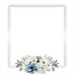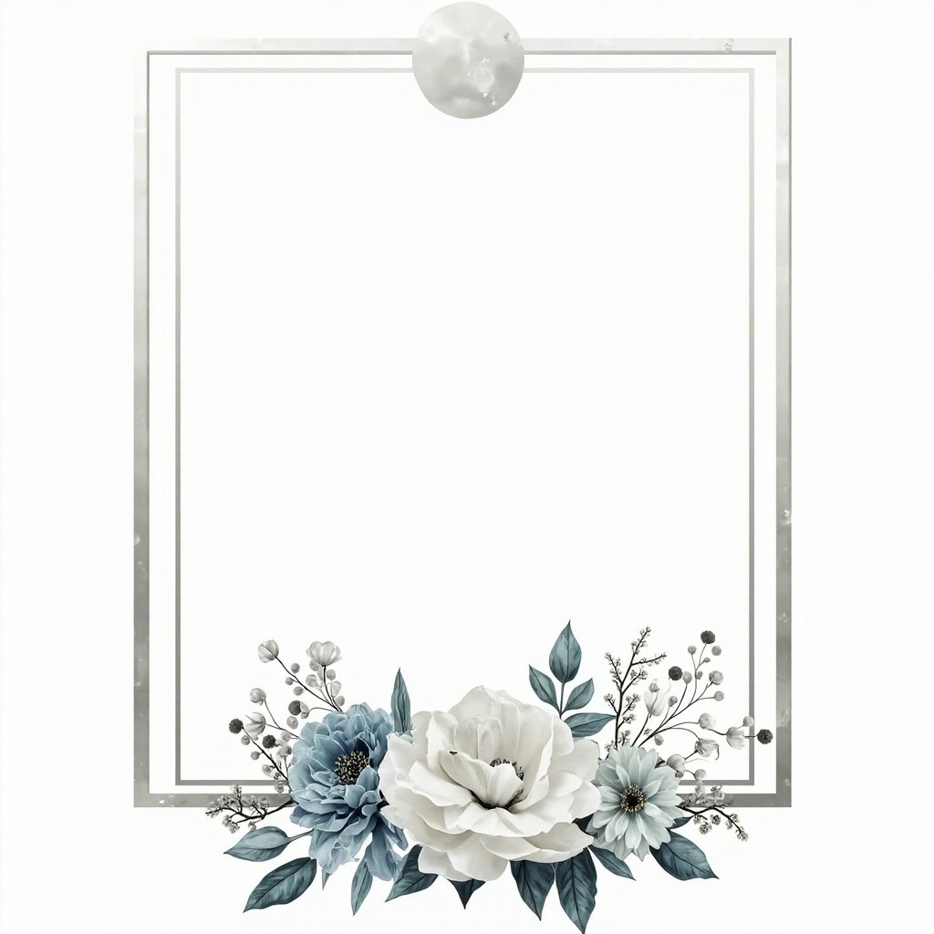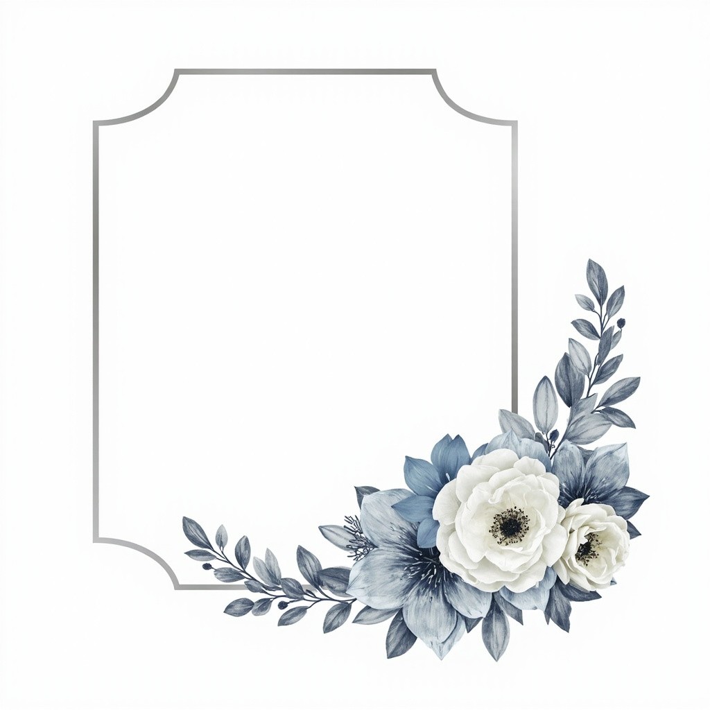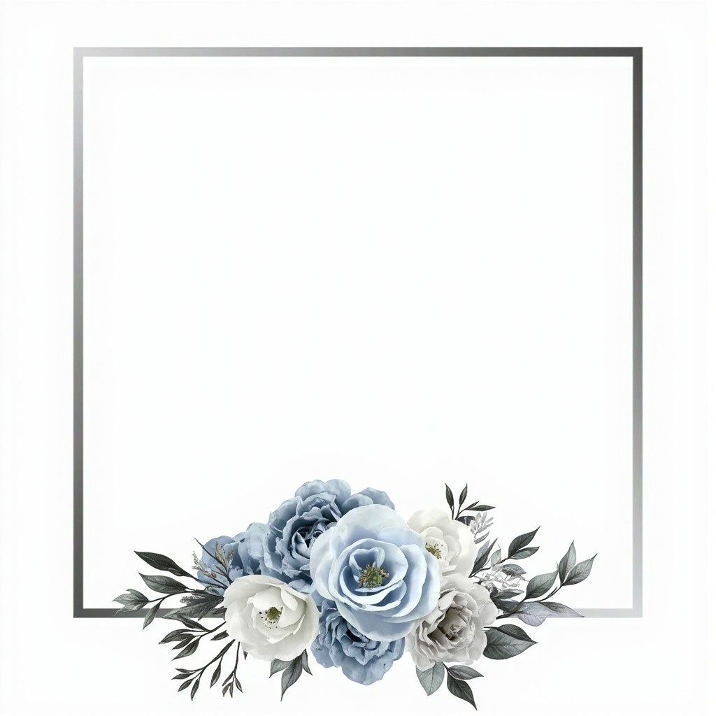 You are an experienced graphic designer specializing in wedding invitations, with a keen eye for visual aesthetics and a mastery of color coordination. I request your expertise to design an elegant wedding invitation frame with the following specifications: A silver frame to elegantly surround the invitation content. The frame should be a simple line. A rectangular shape with a rounded top edge should serve as the main text area. A large arrangement of elegant flowers should fill the bottom of the frame, using harmonious colors of white, silver, light blue, and gray. The final design should be delivered in high-quality PNG format with a transparent background for multiple uses. The overall design should reflect sophistication, balance, and beauty, befitting a formal wedding invitation. Please utilize your advanced design skills and deep understanding of wedding aesthetics to produce a visually appealing and meticulously crafted invitation frame that meets these detailed criteria.