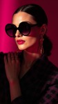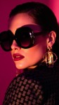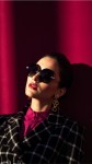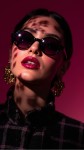 Luxurious elegant masterpiece, Fashionable shoot in Chanel style, Cover of Vogue magazine, Fashion photography, editorial style, fashionable black-magenta sunglasses with stylish round frame, backlight on face, drawing light, unusual shadows on the face, black-gray-deep magenta checkered lined pile terry suit, golden geometric slimline earrings, crimson-deep magenta background, audacity, challenge, passion