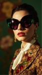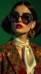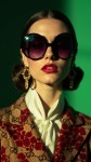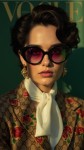 Luxurious elegant masterpiece, Fashionable shoot in Chanel style, Cover of Vogue magazine, Fashion photography, editorial style, fashionable black-magenta-emerald sunglasses with stylish round frame, backlight on face, drawing light, unusual shadows on the face, maximum detailed traditional suit with brand Gucci patterns, white silk scarf around the neck, golden geometric earrings, khaki, brown, cherry color, wine color and heart shades of red and a rich green range