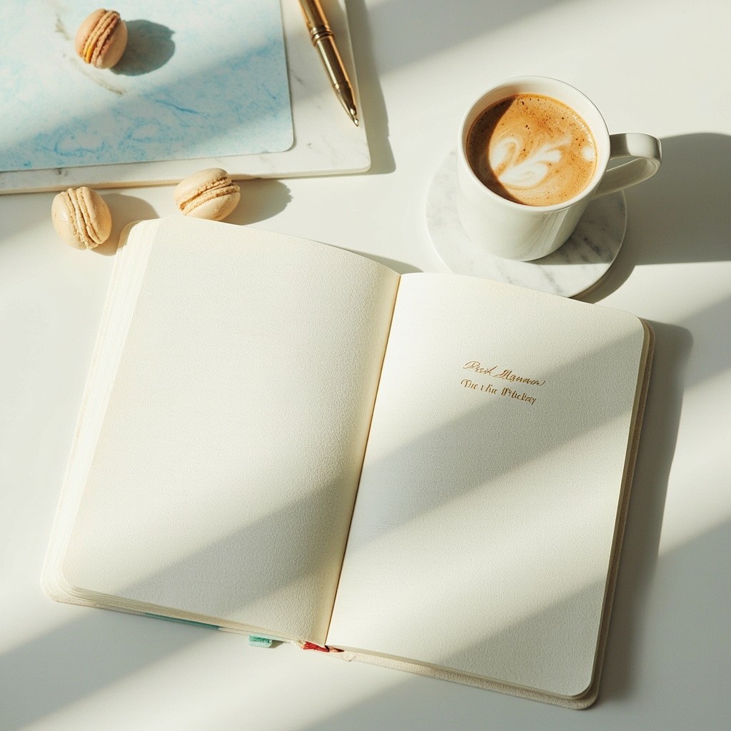 A high-end, minimalist flat lay composition from directly above. In the center, an open, elegant journal with fine linen texture and gold-foil writing that subtly says 'Week Planner'. Next to it, a ceramic mug with latte art, a few gold-and-white macarons on a marble coaster, and a tasteful, vintage-style pen. The color palette is soft cream, pastel blue, and touches of gold. Natural, soft sunlight from the side, creating long shadows.”