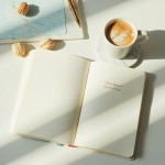 Minimalist Flat Lay of Elegant Journal, Latte Art Mug, and Vintage Pen