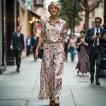 Create a women over 40 years old who has short blonde hair, is pretty with full make up and jewelry. She is wearing a short silk printed blouse with notch collar and crystal necklaces in pink, pale green and diamond.over matching wide leg printed palazzo pants to reach floor. Her shoes are high strappy sandals and a small evening bag. Keep pants silmple in design. Print should be small florals in pink, pale green, ivory with navy blut accents. shoes should be platforms. Show full shot from head to toe in city setting.