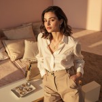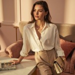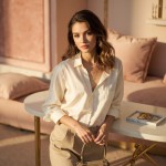 High-end lifestyle fashion image for a women’s online store, featuring a young, elegant female model with subtle makeup and soft wavy hair, wearing a cream silk blouse, tailored beige trousers, and delicate gold jewelry (necklace, rings, earrings), holding a designer-inspired handbag, standing near a minimalistic luxurious table with velvet cushions and a small marble tray displaying rings and bracelets, soft natural golden-hour lighting with warm highlights, pastel pink and soft beige background with subtle gold accents, editorial photography style, shallow depth of field focusing on model and products, products look tactile, desirable, and premium but accessible, sophisticated and polished composition, feminine and aspirational vibe, visually appealing for Instagram and Spotify page, conveys elegance, refined taste, modern luxury, soft shadows and warm inviting atmosphere, composition balanced for digital marketing, highlighting clothing, accessories, and jewelry in a cohesive luxury setting”