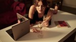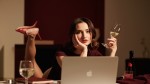 Luxury entrepreneur workspace with a relaxed, celebratory vibe. Laptop closed on a minimalist desk or table. Touches of oxblood in the scene — subtle accents like a wine-colored notebook, fabric, or glassware. Includes a champagne glass or bottle. Lighting is warm, soft, and editorial. Woman (brunette) is seated with elegant posture, face mostly obscured or out of frame. She’s holding a stemmed glass of champagne or a stylish cocktail, showing off manicured nails. Her stiletto heels rest on the desk. The scene feels polished, feminine, slightly playful, and high-end. No clutter — soft textures and tonal balance preferred.