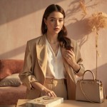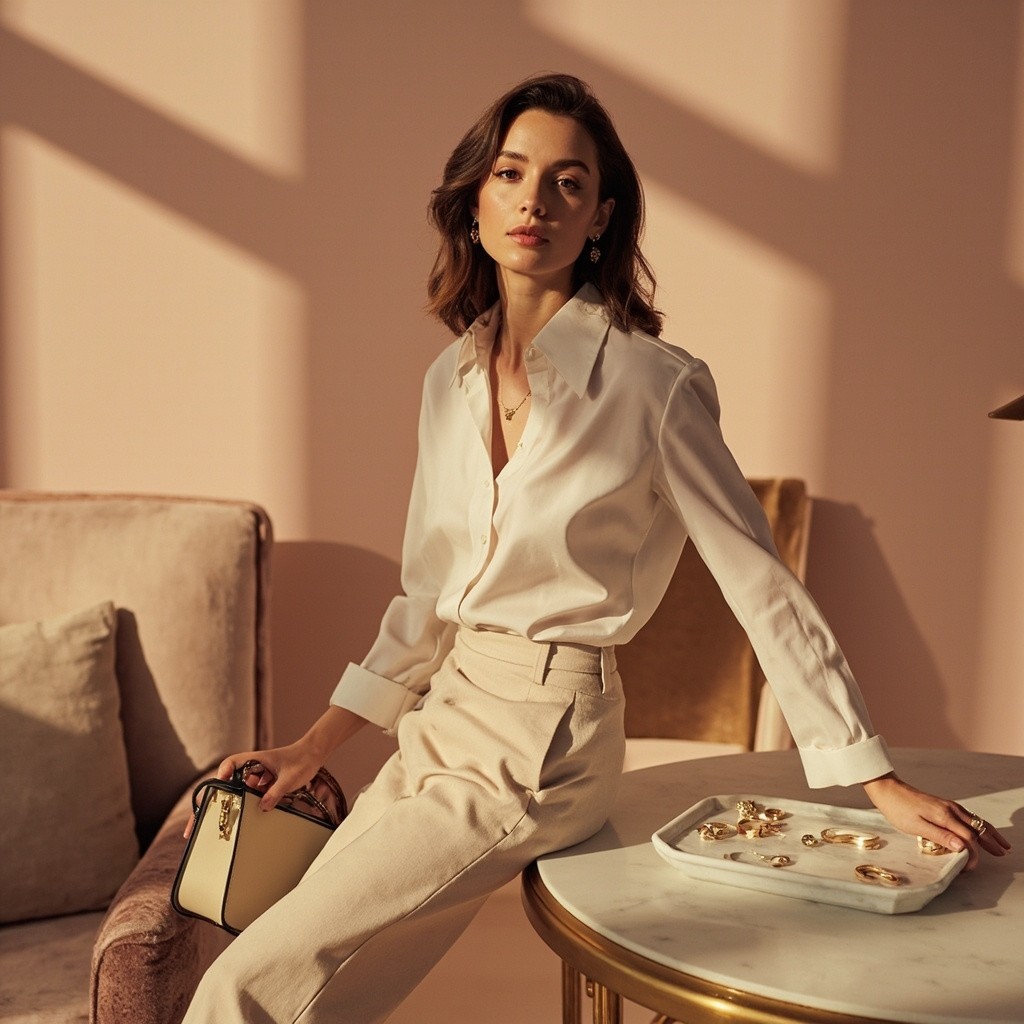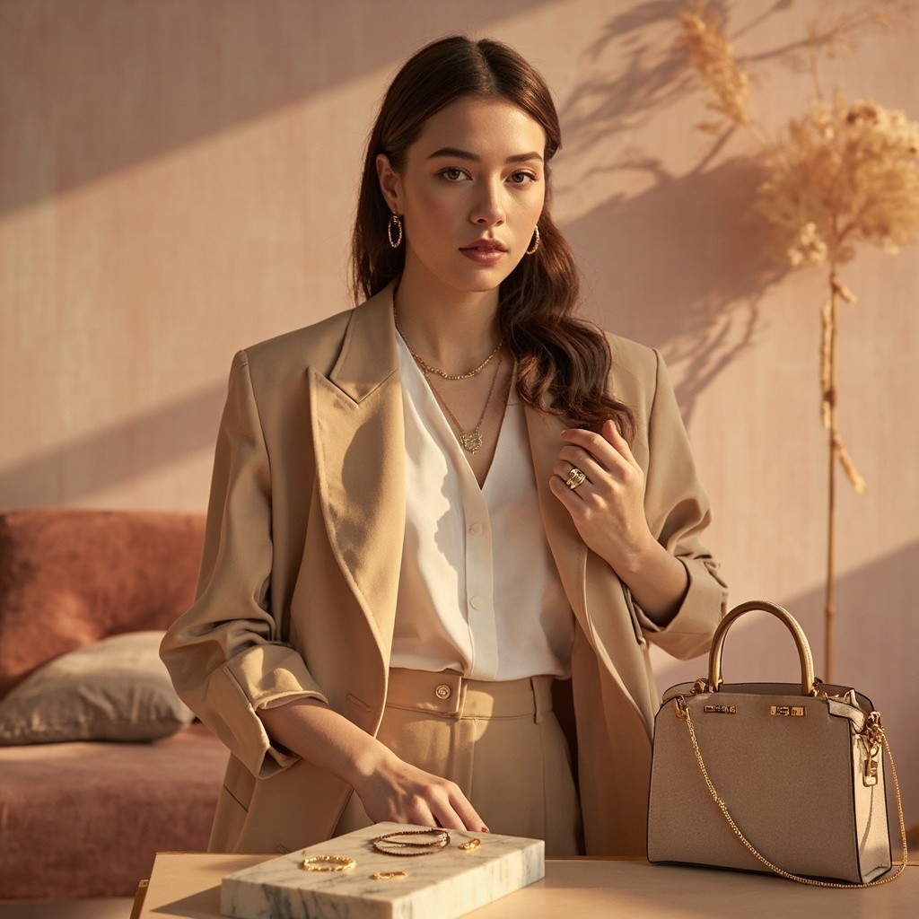 High-end lifestyle fashion image for a women’s online store, featuring a young, elegant female model with subtle makeup and soft wavy hair, wearing no top, tailored beige trousers, and delicate gold jewelry (necklace, rings, earrings), holding a designer-inspired handbag, standing near a minimalistic luxurious table with velvet cushions and a small marble tray displaying rings and bracelets, soft natural golden-hour lighting with warm highlights, pastel pink and soft beige background with subtle gold accents, editorial photography style, shallow depth of field focusing on model and products, products look tactile, desirable, and premium but accessible, sophisticated and polished composition, feminine and aspirational vibe, visually appealing for Instagram and Spotify page, conveys elegance, refined taste, modern luxury, soft shadows and warm inviting atmosphere, composition balanced for digital marketing, highlighting clothing, accessories, and jewelry in a cohesive luxury setting”