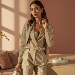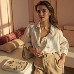 Luxury Fashion Image of Elegant Female Model in Beige Trousers and Gold Jewelry