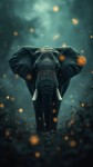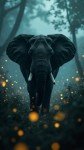 Majestic Elephant Walking in Foggy Jungle at Dawn with Fireflies