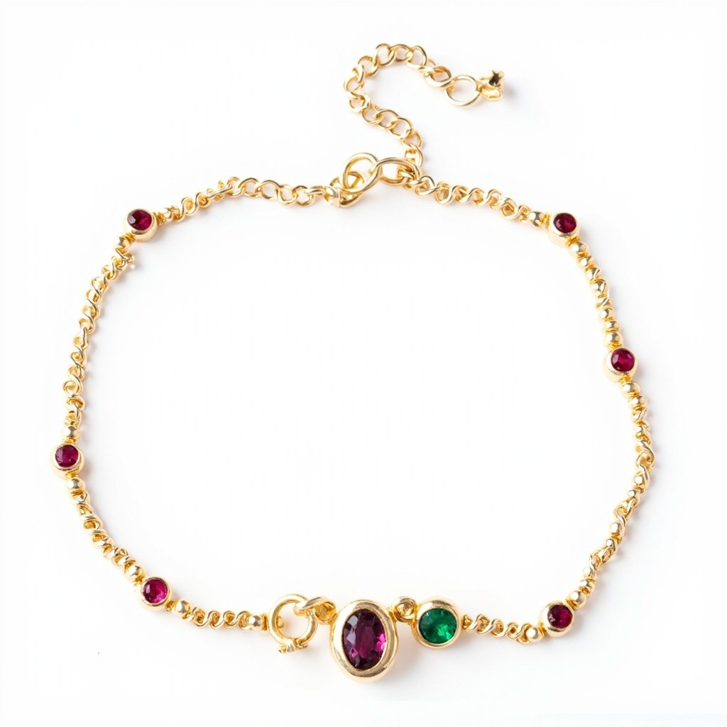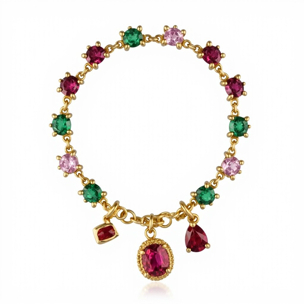 Top-Down View of Gold Charm Bracelet with Emerald and Ruby Stones