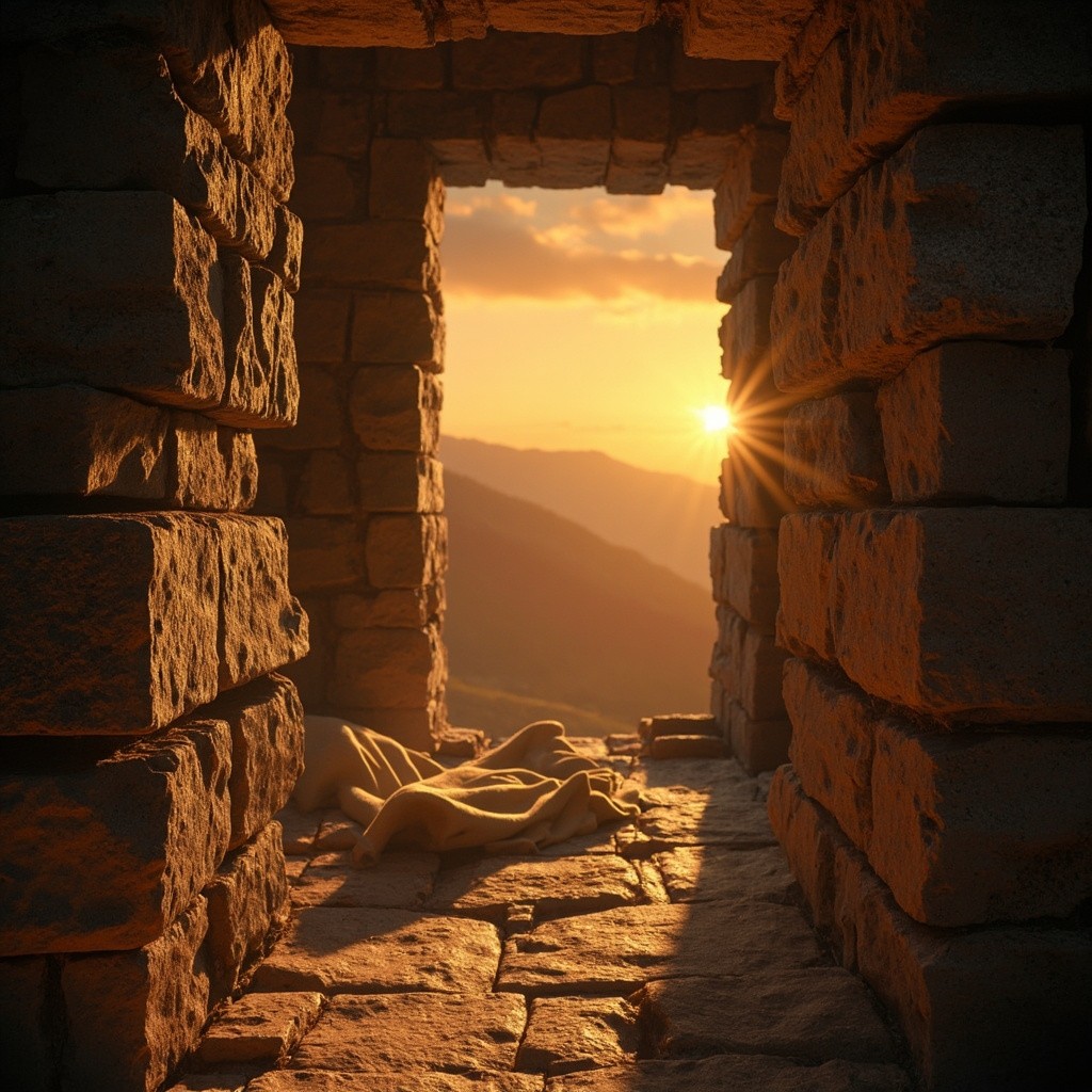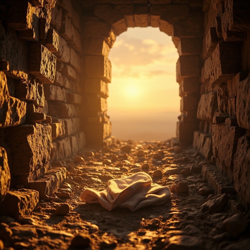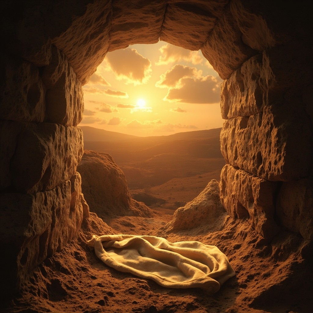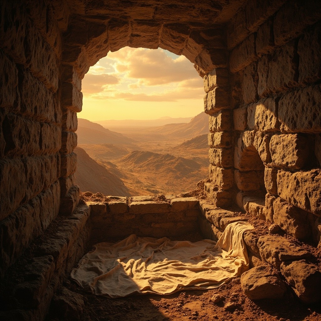 Empty Tomb at Sunrise with Folded Cloth After Jesus' Resurrection