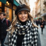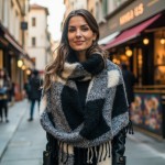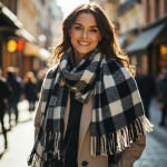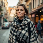 Bright Street Scene with Friendly European Model Promoting Checkered Shawl