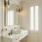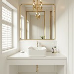 A hyper-realistic European-style modern luxury bathroom features a single vanity basin beneath a large gold-trimmed mirror. A golden chandelier hangs from the ceiling above the mirror, and windows provide natural light. Below the mirror, a white countertop houses a single white sink with a gold faucet, adorned with neatly arranged toiletries. Walls are painted in a light beige hue, with white shutters adorning the window frames. Pure white plaster walls remain immaculate and flawless. 8K resolution, high detail, premium quality, and authentic photographic rendering.