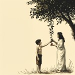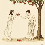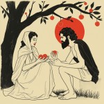 Minimalist Illustration of Eve Tempting Adam with Forbidden Fruit