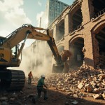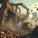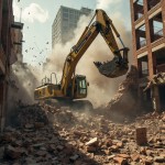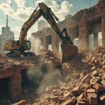 Demolition Scene with Heavy Excavator and Collapsing Brick Building