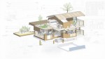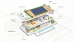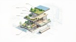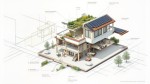 Green House Axonometric Architecture, Labeled Parts, Rooftop Garden, Solar Panels, Blueprint Background