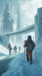 Ice Age Urban Wasteland with Skyscrapers and Heat-Suited Explorers