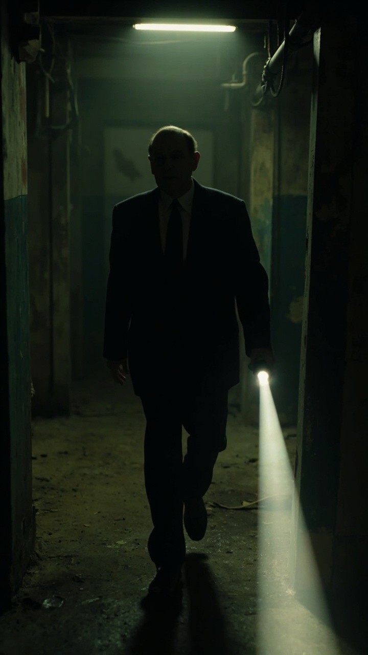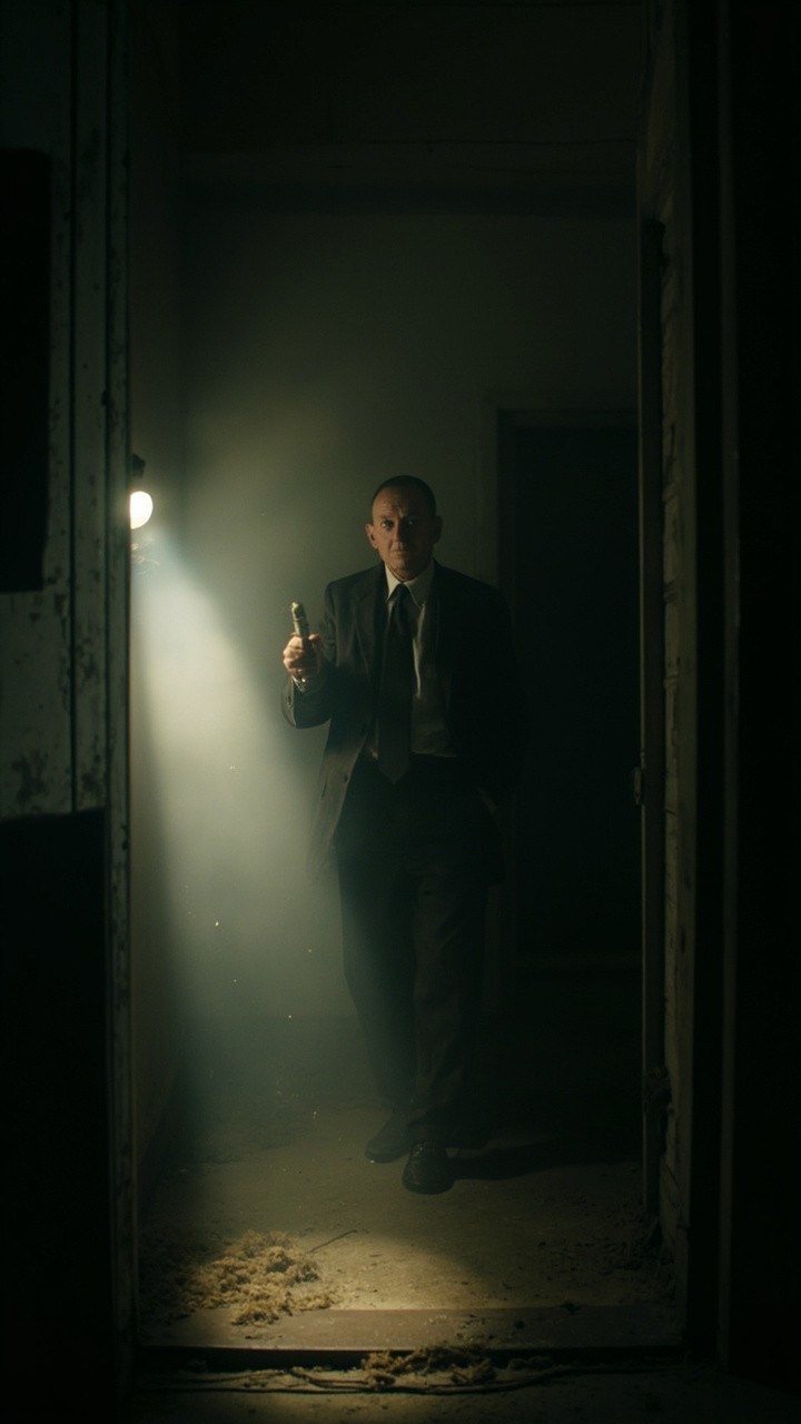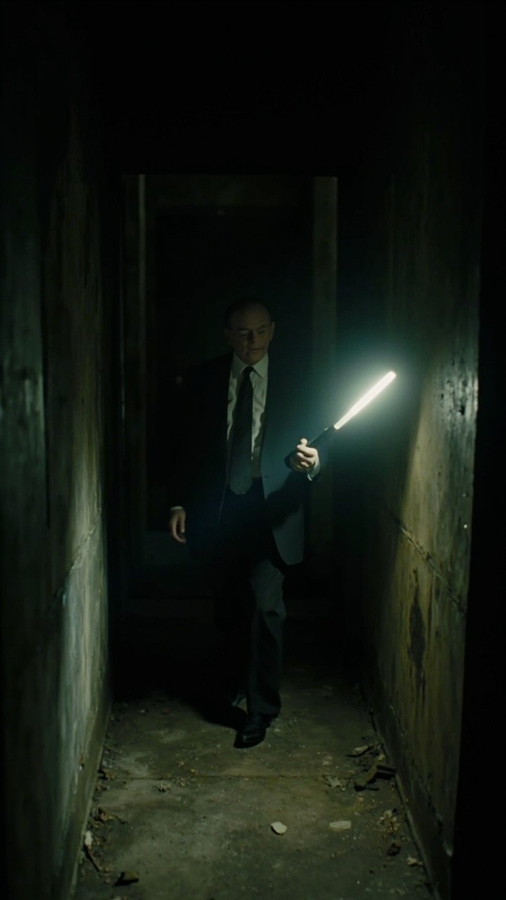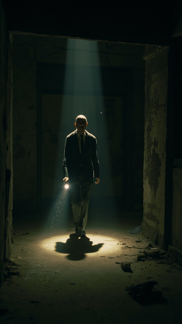 The camera represents a real human point of view walking slowly inside the same location. Movement is grounded and realistic: subtle vertical bob from footsteps, gentle side-to-side sway, imperfect handheld motion. The viewer is holding a flashlight the beam reacts naturally to walking and tuming with delayed movement, small overcomections, uneven scanning. The character remains completely still and lifeless; no animation, no blinking, no breathing, no movement. Only environmental motion: floating dust, minimal light flicker, very subtle movement of loose elements. The environment stays consistent the whole shot: no set changes, no teleporting, no new objects. Photorealistic video, found-footage realism, handheld walking camera, low light, strong shadows, gritty textures, natural imperfections ) Mr bean