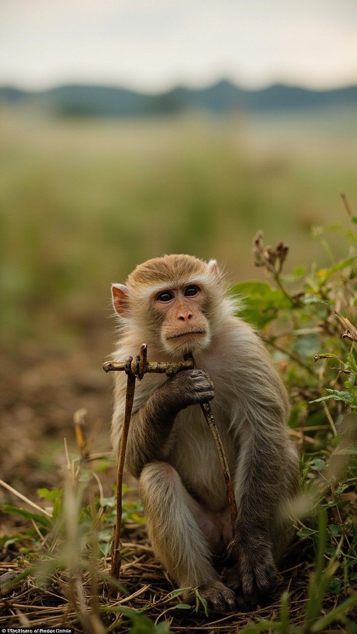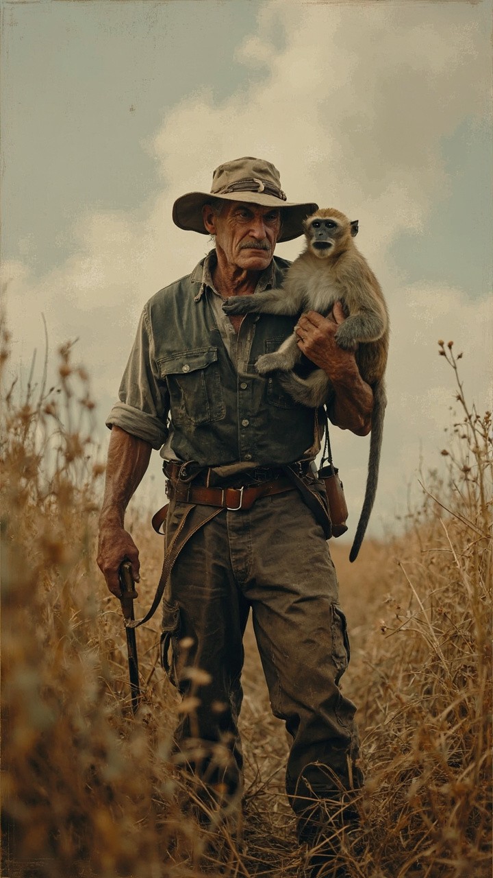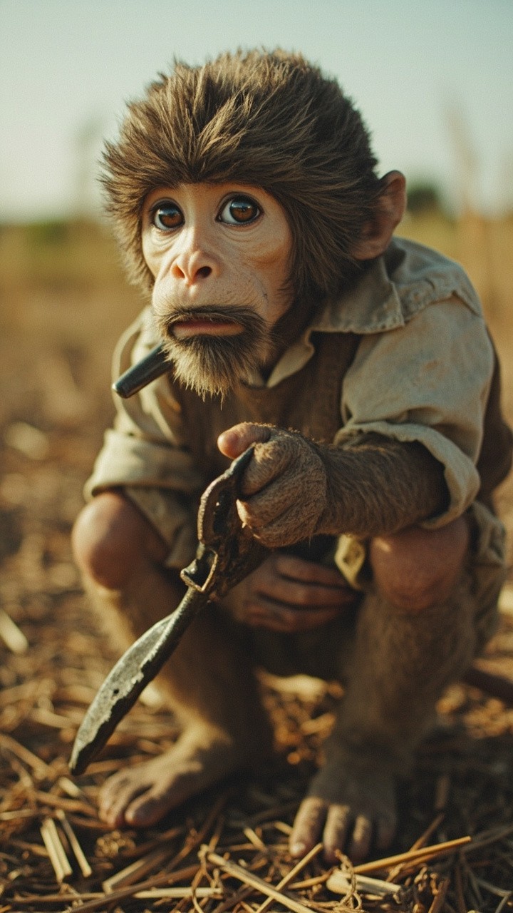 Farmer Working in Fields with Mischievous Monkey