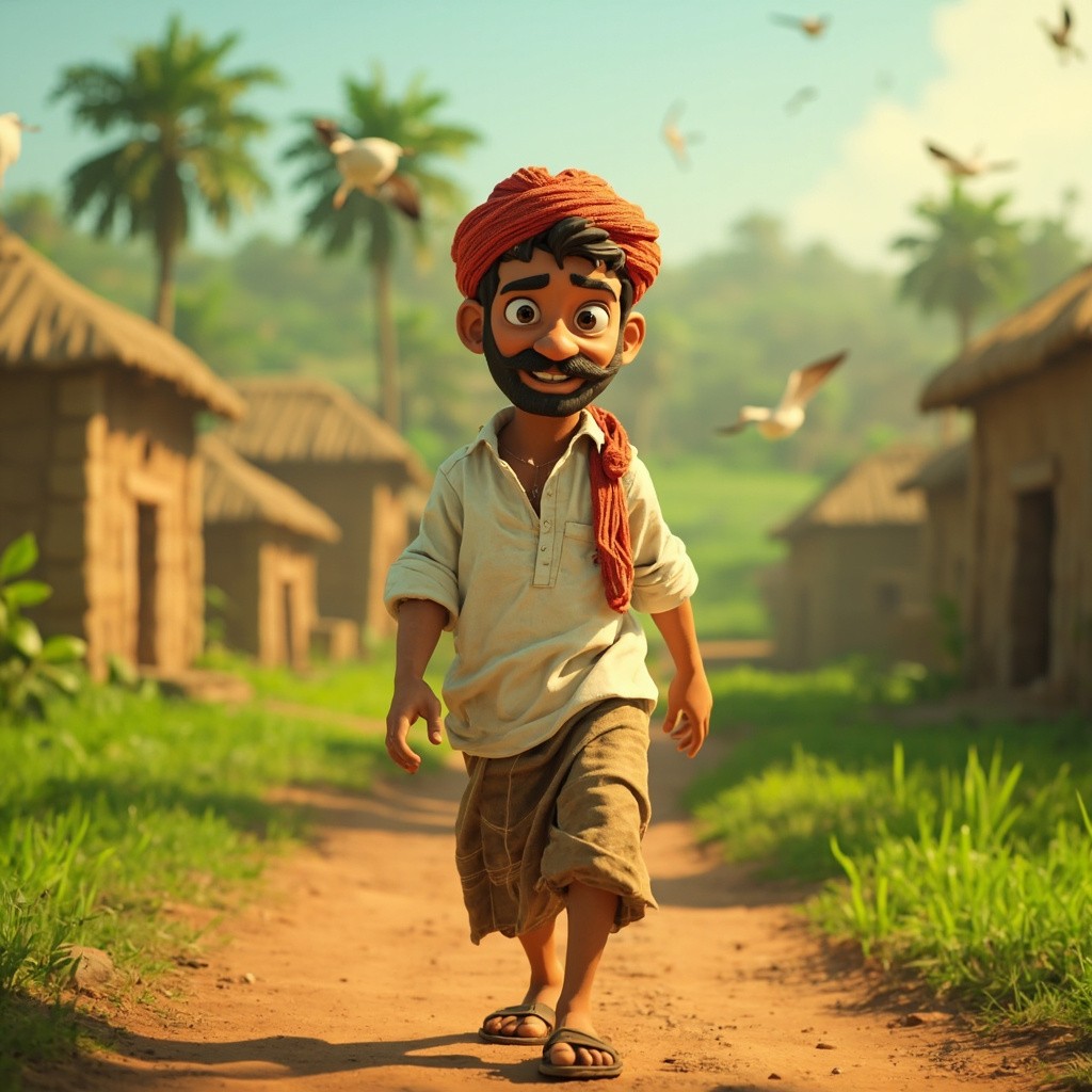 3D cartoon style Indian village morning scene, green farms and mud houses, birds flying, a small dirt road through the village, farmer Raghav walking happily toward his fields, medium height Indian farmer with light beard and moustache, wearing white kurta, dhoti and red gamcha on head, warm smile, cinematic lighting, Pixar style, vibrant colors 3D cartoon style Indian farmer character, Raghav, 38–40 year old village farmer, medium height, slim but strong body, warm brown skin, round friendly face with thick black mustache, short black hair, kind and hardworking expression, wearing simple cream/white kurta, brown dhoti, red cotton gamcha on shoulder, old brown sandals, slightly dusty clothes from farm work, humble rural personality, standing naturally like a hardworking farmer, Pixar style 3D animation, soft cinematic lighting, detailed textures, colorful animated movie style.