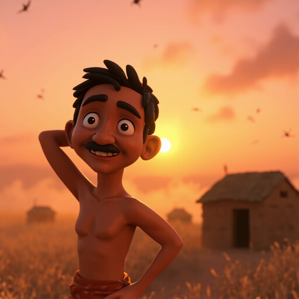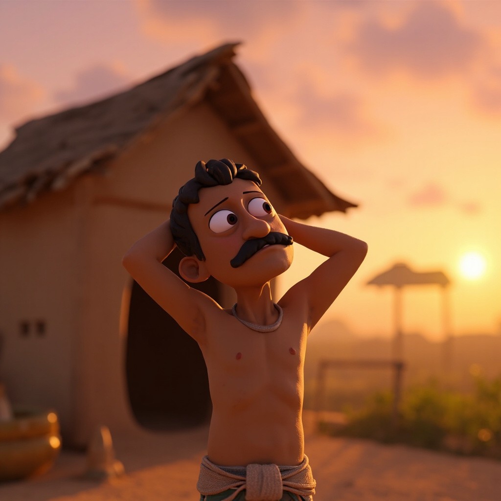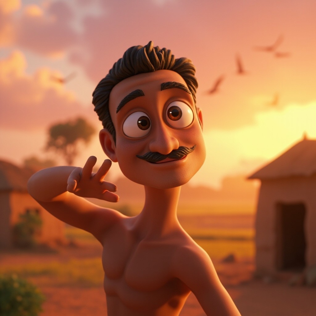 A 3D cartoon style Indian village at sunrise. Ramu, a middle-aged Indian farmer (same appearance as described), is waking up early in front of his small mud house. The sky is orange and pink, birds flying, light fog in the fields. Ramu is stretching and getting ready for work, peaceful village atmosphere, cinematic wide shot. A middle-aged Indian farmer named Ramu, shown in 3D cartoon / Pixar-like style. He has warm brown skin, a round friendly face, big expressive eyes, and a small neat black mustache. His hair is short, black, and slightly wavy. His body is slim but strong, showing years of hard farm work.