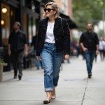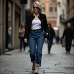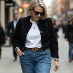 create one black tweed Chanel-like jacket that is cropped to the waist and put it on a chic, 40 year old women who is highly fashionable. She should be a Plus size woman with an apple-shaped with a full midsection and no apparent waist curve. She should be wearing jeans with a belt, a white tee that is tucked into the jean and tan ballet flats with a black toe cap. Hair should be short bob and sunglasses. Show her in a street scene. Show full head to toe image.