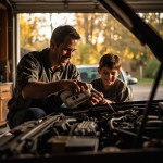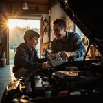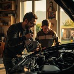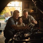 Smiling Father and Teenage Child in Cozy Garage, Preparing Car