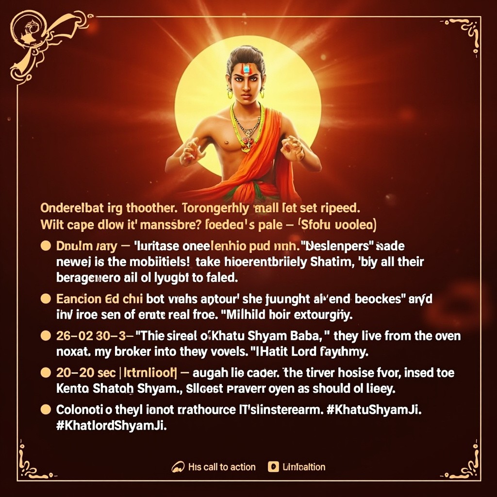[0–3 sec – Hook / Attention Grabber] क्या आपकी जिंदगी में हर राह बंद हो गई है? [3–10 sec – Faith / Miracle] घबराइए मत… क्योंकि जिसने श्याम का नाम लिया, उसकी हर दुआ पूरी हुई। [10–20 sec – Emotional Punch] हारे का सहारा — मेरा श्याम! खाटू श्याम बाबा की कृपा से, टूटे हुए भी जीत जाते हैं। [20–30 sec – Call-to-Action / Viral Hook] नाम ही काफी है… श्याम नाम ही सब कुछ है। जय श्री श्याम! #KhatuShyamJi