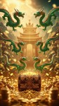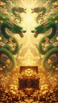 symetry composition image five green dragons chinese old tradition style five dragons fly over the sky protect the millions of golden coin and money and doller coin btc coin stoack on the floor millions of coin on the floor chest full of chinese element design five dragons full body dragon cinematic lighting image background is shiny gold palace