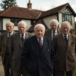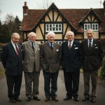Five Older Gentlemen Wearing Different Suits in Front of an English Cottage