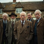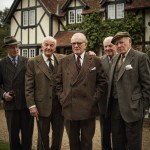 Five Middle-Aged Gentlemen in Tweed Suits Outside English Cottage