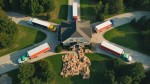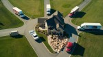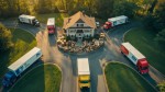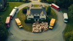 Top View of American Suburb Home with Colorful Delivery Trucks on Connecting Roads