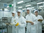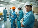 Four Asian Workers at a Food Factory Cleanroom, Full Body, Holding Tools