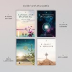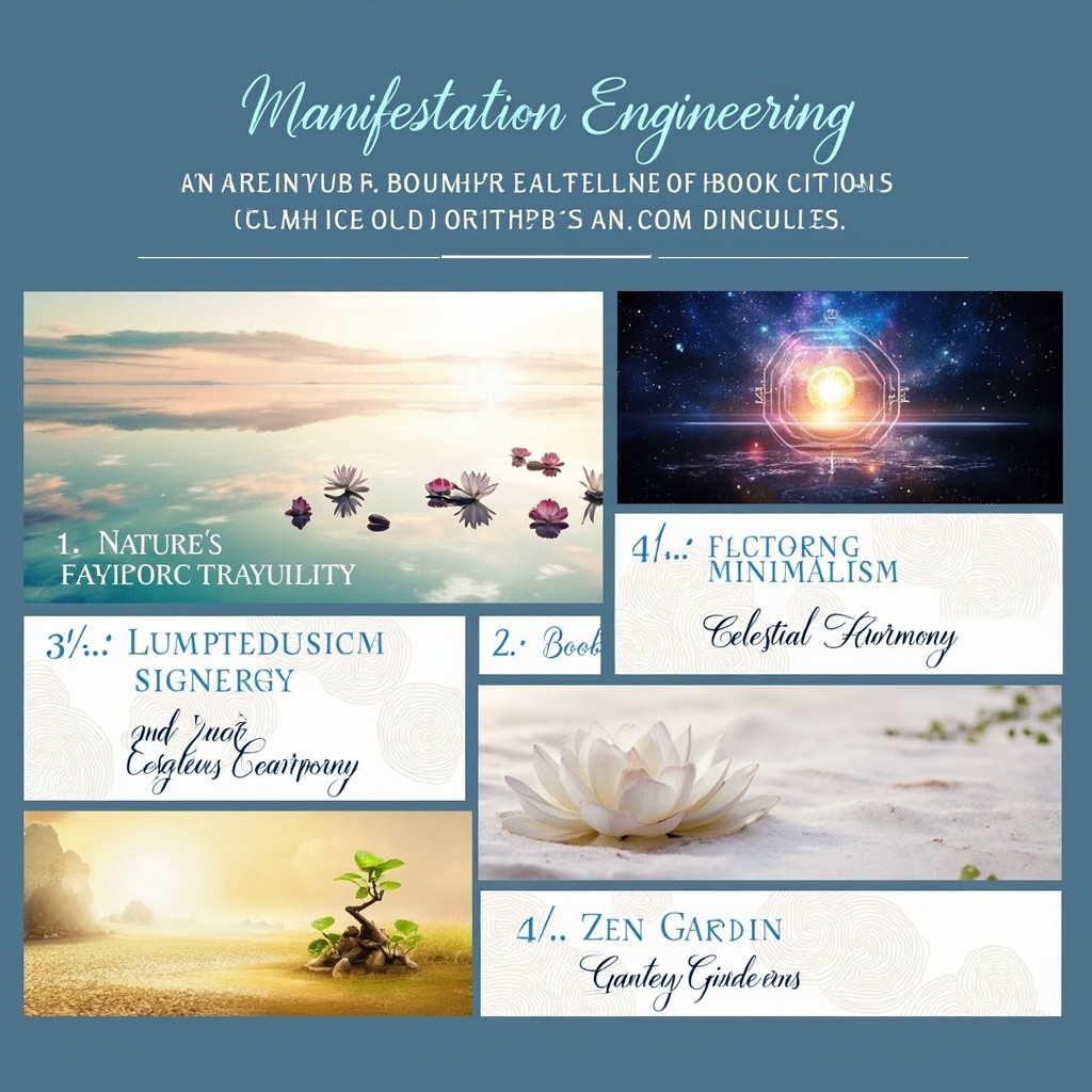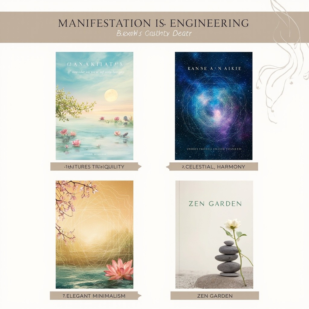 Necesito una imagen para la portada de un e-book, que habla acerca de la ingeniería de la manifestación, la portada debe contener una paleta de colores agradable que transmita armonía, elegancia, paz, tranquilidad, que invite a comprar el e-book. dame 4 opciones totalmente diferentes a estas que has generado