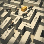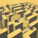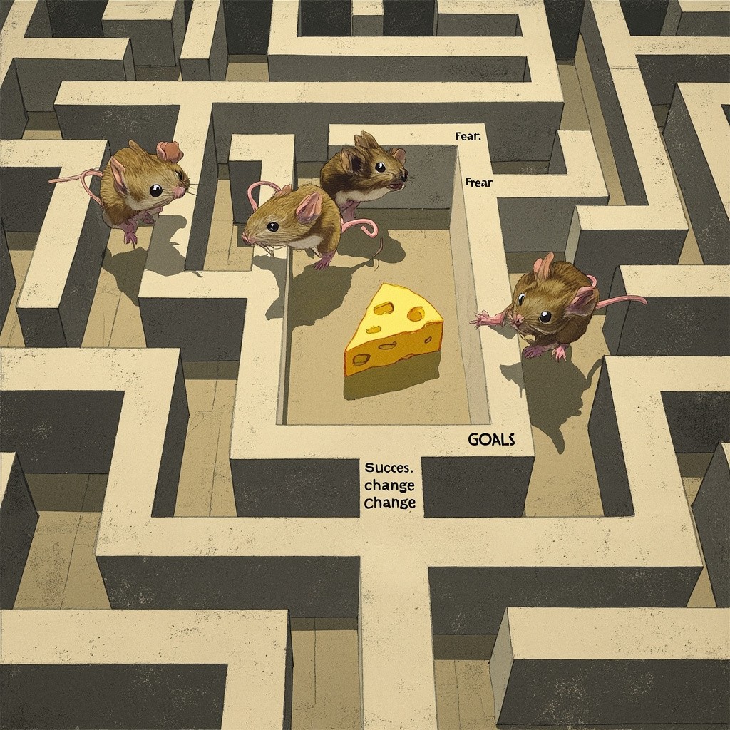 Maze Illustration with Four Mice and Cheese Goal, Featuring Words Success, Change, Fear