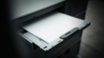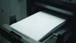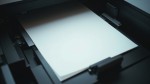 a photorealistic image of a blank white A4 poster that is sitting on a printer tray as if it had just come out of the printer and is hot off the press with hints of a magazine publication. the framing of the image is a little offset and framed artistically to make for a less polished and rigid visual, but it still looks intentional. It's a medium close-up shot with no additional props. The colours are muted and the contrast is high with graphic shadows. shot with a 50mm camera in an urban, editorial space. keep it minimal and mostly monochromatic but well lit with a high white point, more medium grays, and a high blackpoint