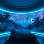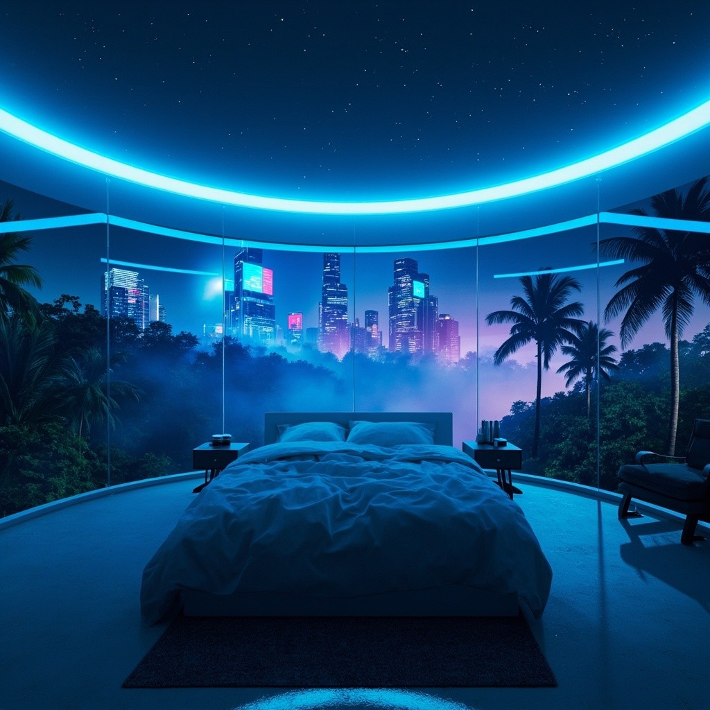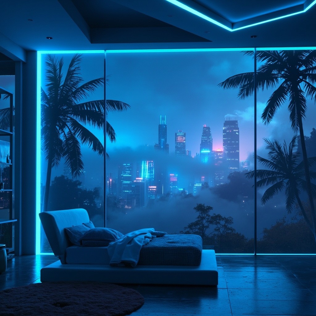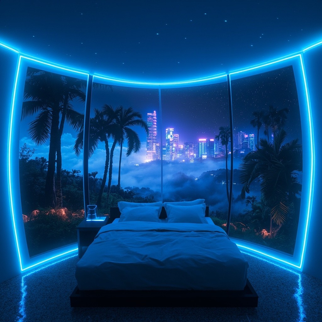 Futuristic bedroom interior at night with large panoramic glass window, sleek minimal bed facing the window, soft blue neon light outlining the window frame, view of a misty tropical forest with tall palm trees and a glowing cyberpunk city skyline in the background, skyscrapers with neon holographic billboards, dreamy blue and purple lighting, cinematic, ultra-realistic, ambient mood