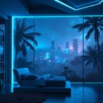 Futuristic Bedroom Interior with Neon Light, Panoramic Window, Forest and Cyberpunk City View