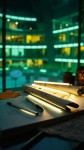 Futuristic Desk with Books, Pens, and Transparent Scroll in Modern University Setting