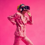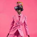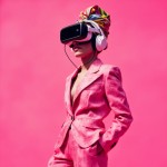 A futuristic, fashion-forward woman in a pink tailored suit with intricate patterns, wearing a VR headset and large over-ear headphones. She has a colorful silk scarf wrapped around her head in a stylish turban. The background is a solid vibrant pink, creating a modern, digital art aesthetic. The composition emphasizes bold colors, tech-meets-fashion vibes, and a confident, upward-looking pose. High detail, editorial style, flat illustration look with soft lighting and slight surrealism.