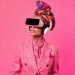Futuristic Woman in Pink Suit with VR Headset, Turban and Headphones, Digital Art Background