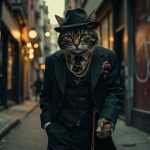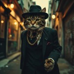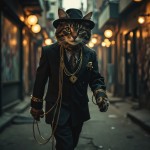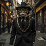 Serious Gangster Cat in Suit and Fedora with Gold Chains Walking in Urban Street