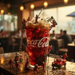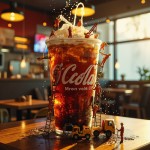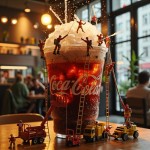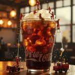 A transparent cup filled with a gigantic hyper-realistic McDonald's Coca-Cola stands on a wooden table, looking super-huge compared to the super-tiny people surrounding it. Twenty super-tiny firefighters in red and white uniforms use cranes, ladders and hoses. Some climb tiny ladders to pour soda, while others adjust the foam with hoses as if they were rushing to the scene of a fire. Some spray soda with firefighter hoses, while others climb ropes attached to cups. The group is immersed in overflowing soda. Miniature forklifts and trucks deliver ice, filling the sides of the cups with ice. Condensation droplets on the cups sparkle under the bright lighting, reflecting the atmosphere of a cafe with a warm surface. The scene features a vibrant and refreshing atmosphere with cinematic lighting, hyper-detailed textures, realistic reflections of water droplets, and blurred lights in the background of a cozy cafe. The world of the little people. A