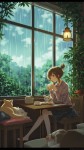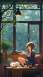 Cozy Anime Café Interior with Napping Cats on Rainy Afternoon