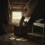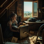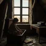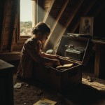 Girl Finds Memory Trunk in Dusty Attic with Diary, Faded Photos, Pisa View and Typewriter on Modern Desk