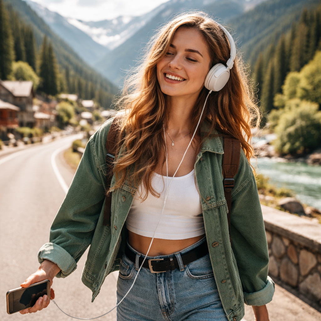 Trendy girl smiling and listening to music while walking in mountain area.
