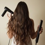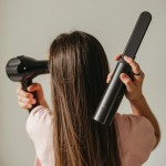 Girl From Behind with Smooth Long Hair, Holding Hair Dryer and Straightener