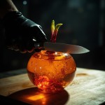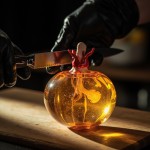 A hyper-realistic, cinematic close-up of a whole [fruit] made of transparent glossy glass, glowing in a soft studio light. The glass fruit is colored [Colour], with a reflective surface and internal sparkles or swirls, placed perfectly centered on a wooden cutting board. A human hand wearing a black glove holds a sharp stainless steel knife just above the fruit, as if ready to slice. The background is softly blurred, and dramatic shadows and light reflections emphasize the glass texture. The [dragon fruit] has a shiny [red and white ] stem, adding a polished detail to the top. Moody, professional lighting, 85mm lens depth of field, ultra-detailed product shot.