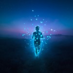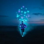 Bioluminescent Person and Butterflies in Twlight Field