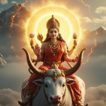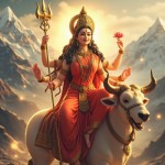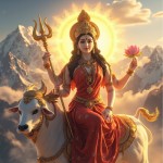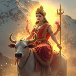 3D Goddess Shailputri Seated on White Bull with Trident and Lotus, Golden Aura, Himalayas Background