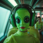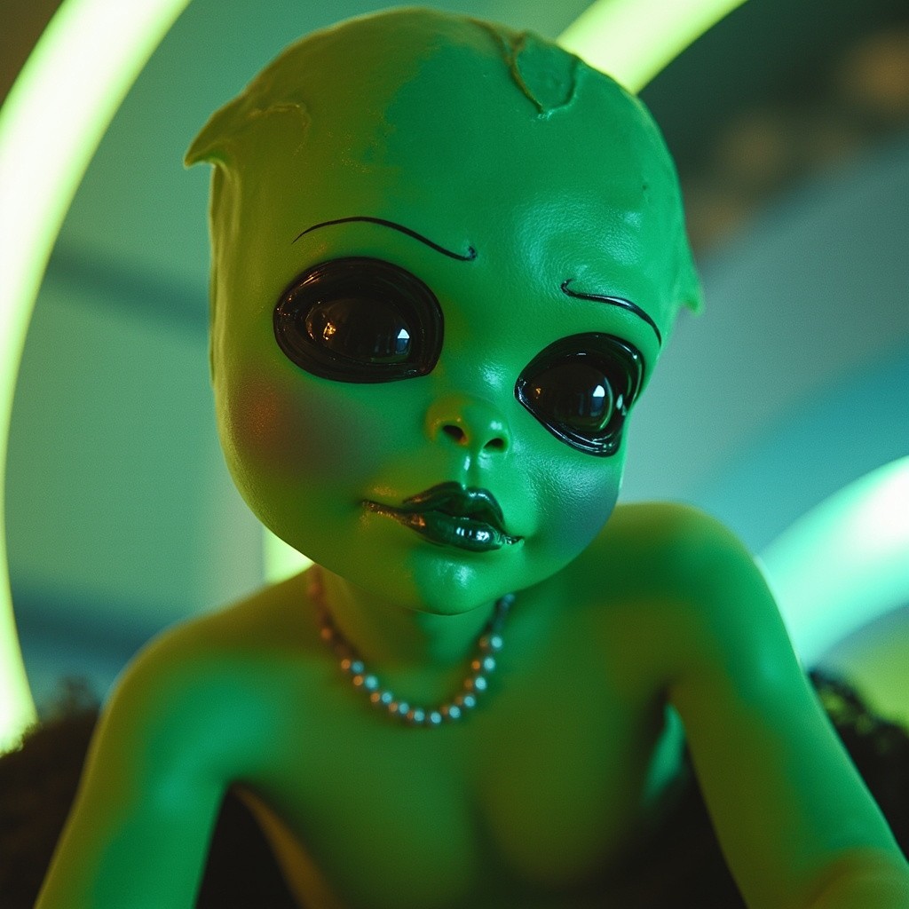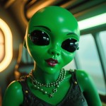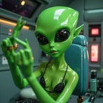 Green Alien Beauty Influencer Making Videos in Spaceship, 90s Anime Cartoon