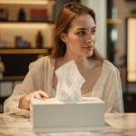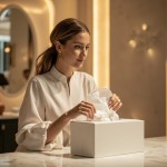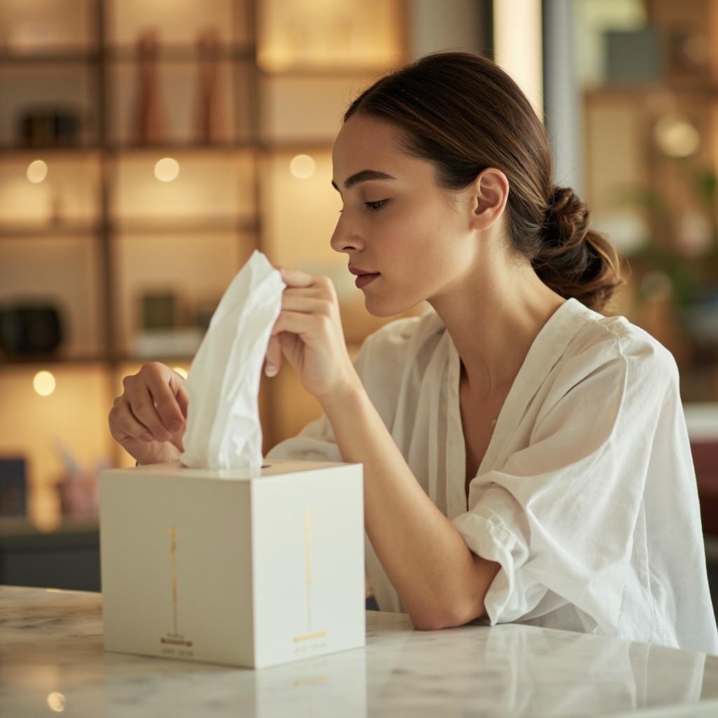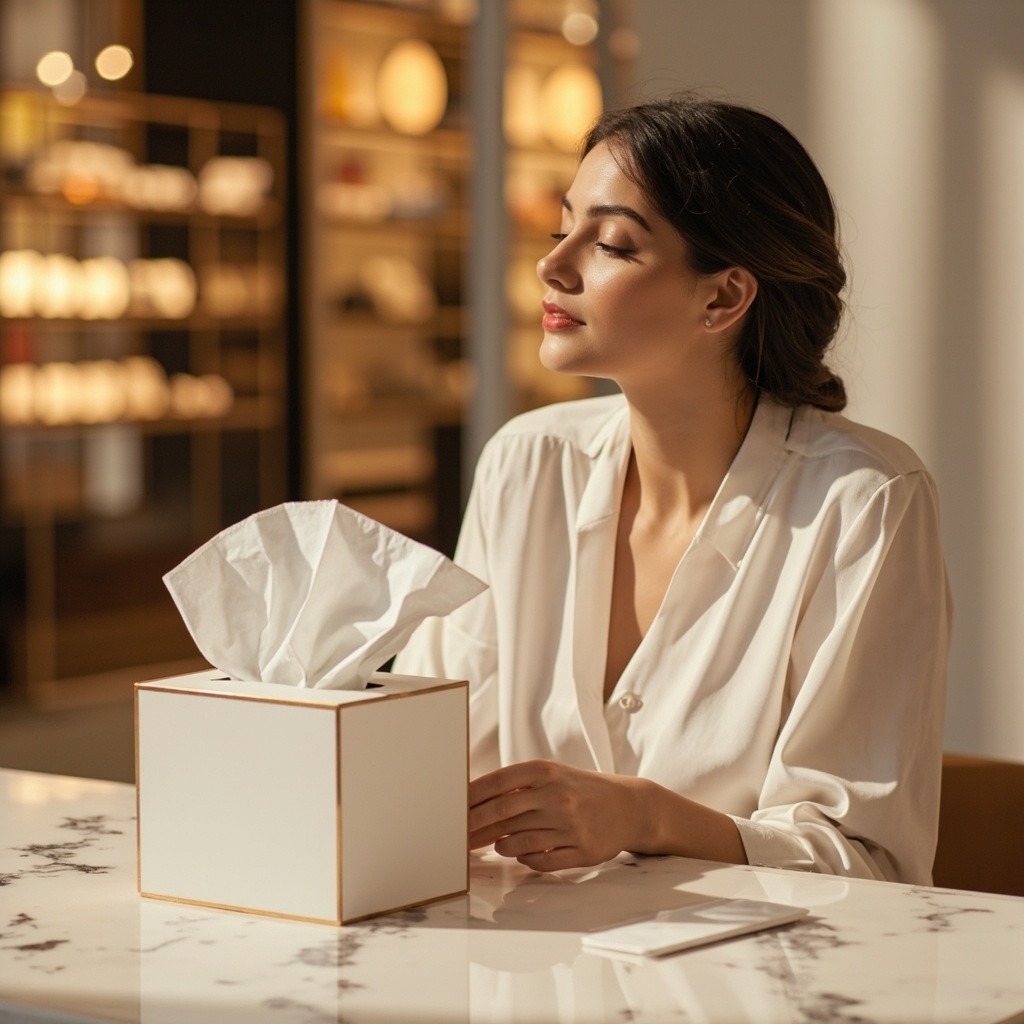 A high-quality, profile picture of a beautiful Gulf woman with soft, natural hair, without a hijab, sitting at an elegant marble table inside a modern, brightly lit store. She is pulling a soft white tissue from a luxurious, minimalist tissue box. The lighting is soft and warm, the background is professionally blurred to highlight the product, and the realistic photographic style makes it suitable as a backdrop for an online tissue store. It features high resolution, sharp details, and calm, luxurious colors. I don't want the tissue box to be visible.